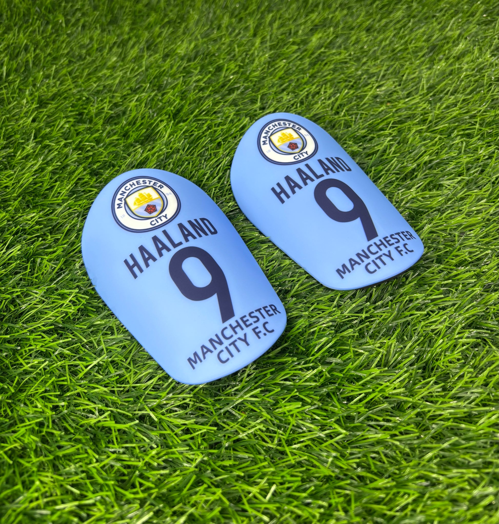 - Ett par snygga benskydd i Manchester City-design med Haalands namn och tröjnummer 9.